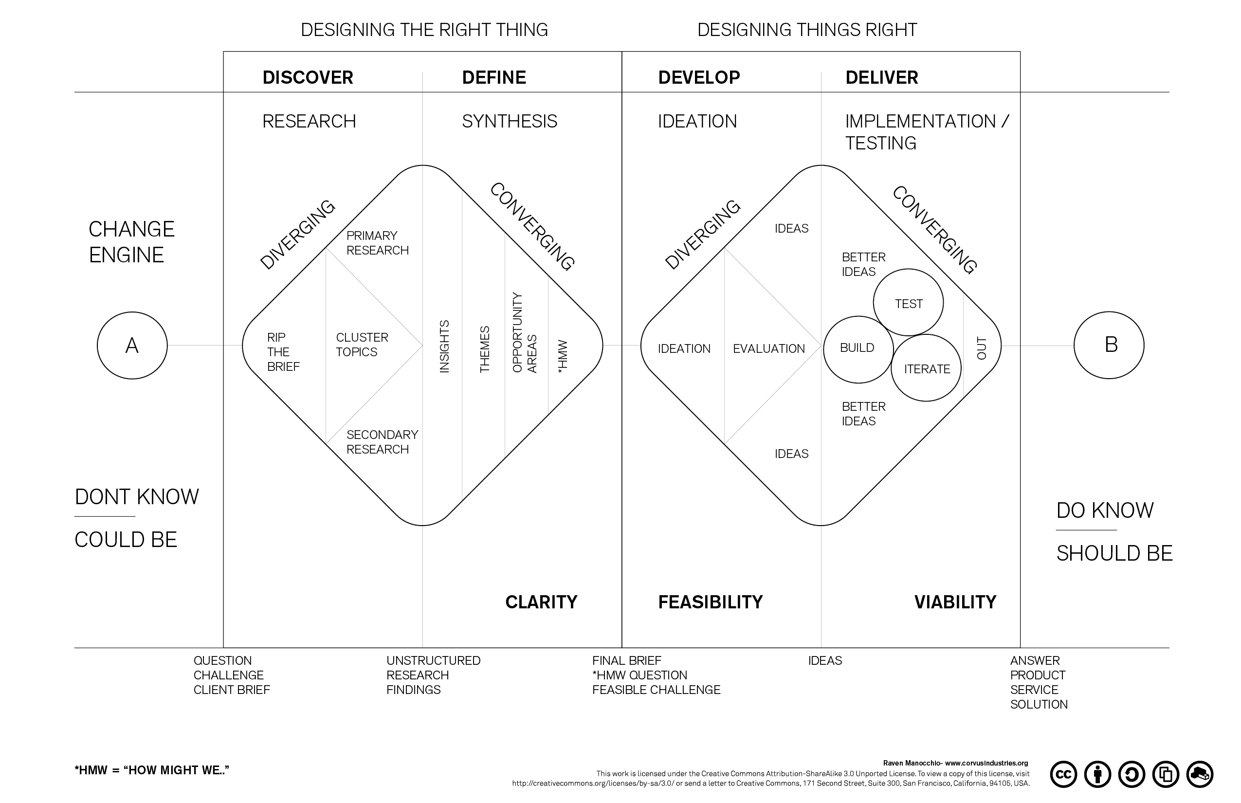 My version of the classic Double Diamond. It is still surprising that many teams and organizations have no formal design process so I often use this to teach, describe and orient teams to a design structure that makes exceptional products and services.